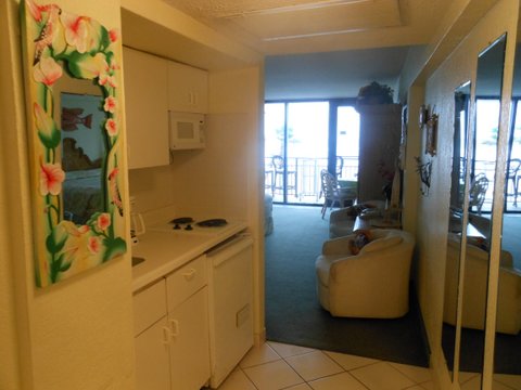 This is a fairly large studio with a galley kitchen and king bed, table with chairs and sofa sleeper. This condo sleeps 4.