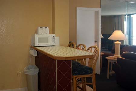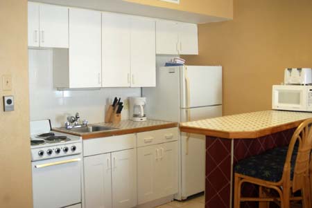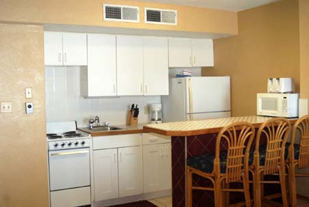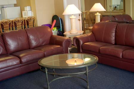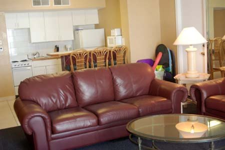 This is an update – basically the condo is the same with the 2 burgandy leather sofas, full kitchen and also eat in kitchen with counter….