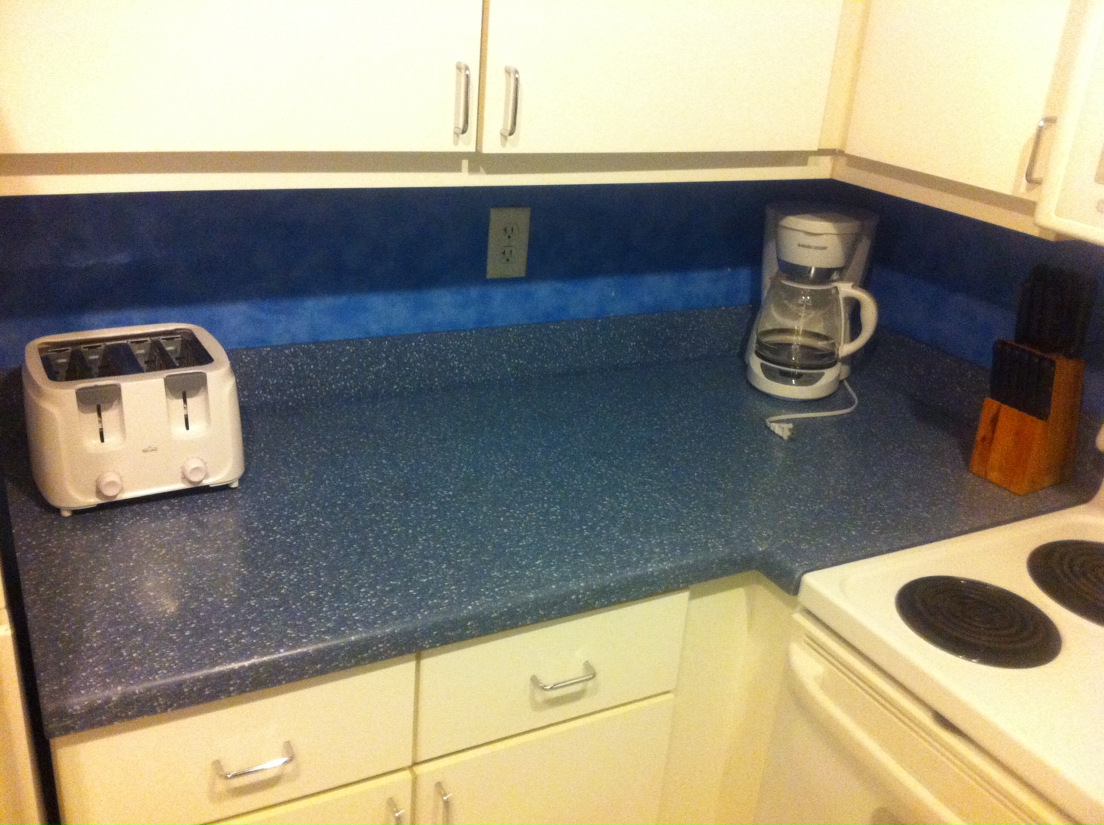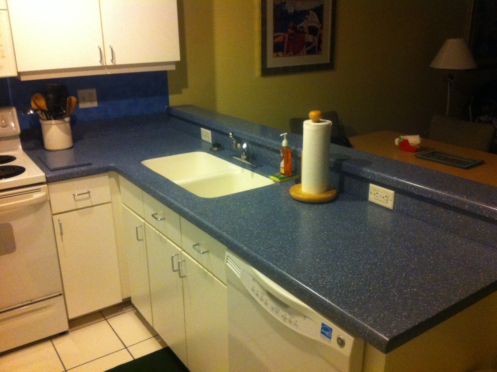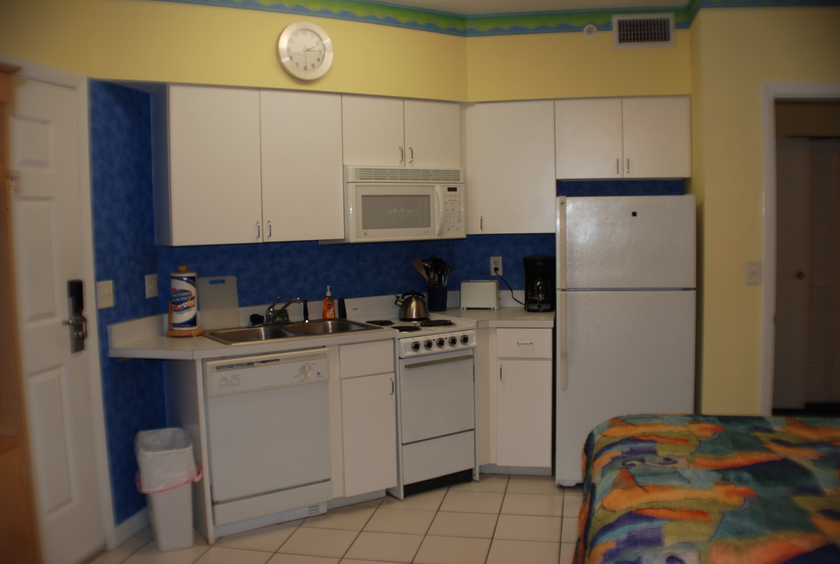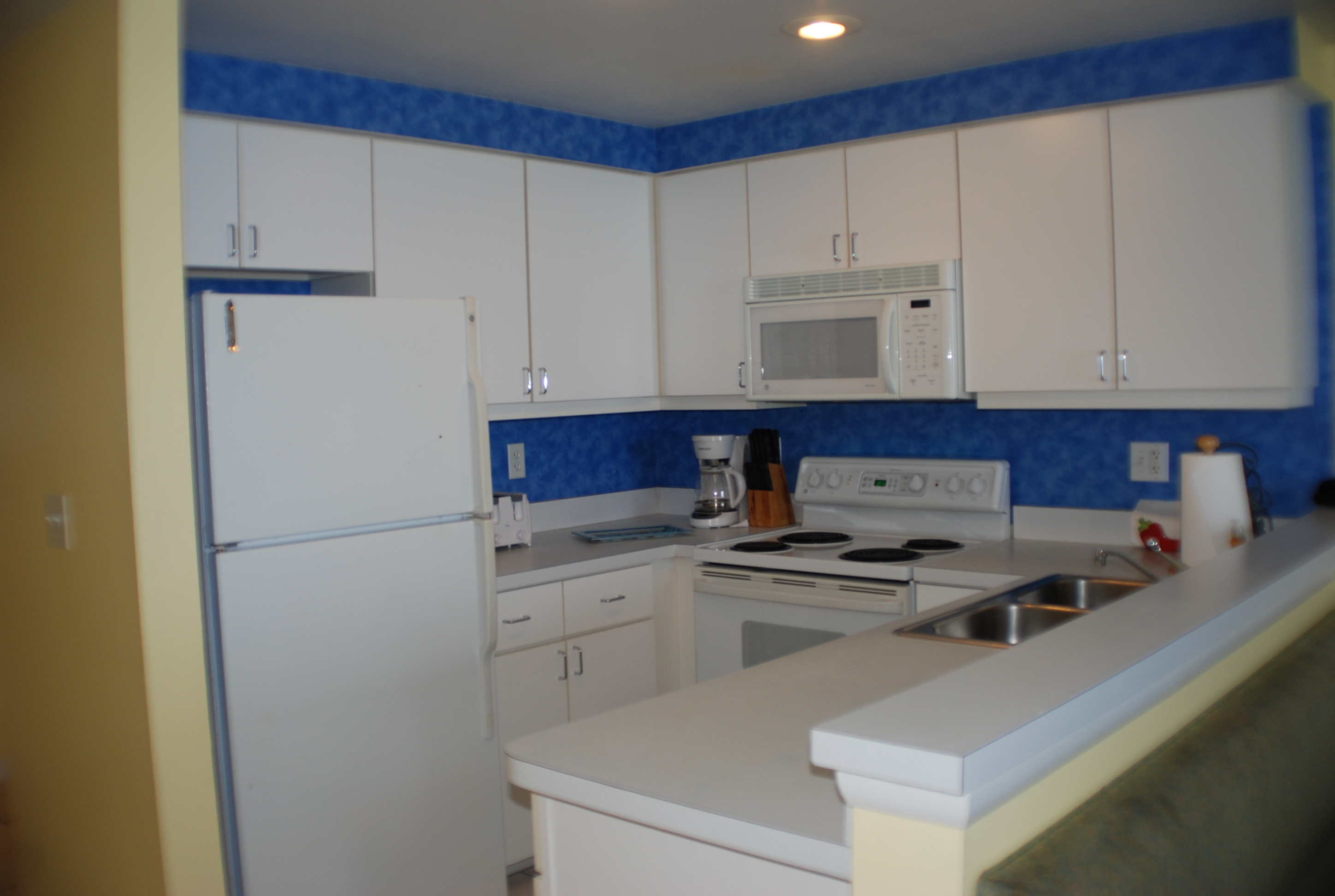 I was purchasing a mircowave for my other unit – and was going to get the stainless steel to start the transition…. when I saw this blue corian counter top with the white cabinets and yellow wall ( I still have the bright blue wallpaper..)